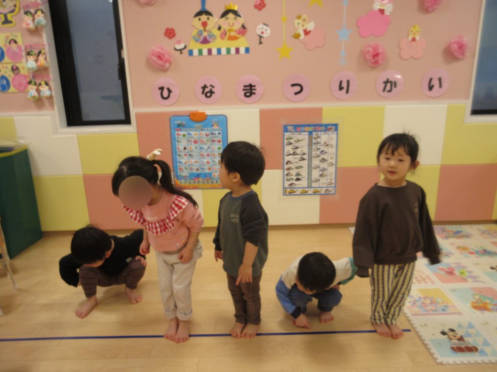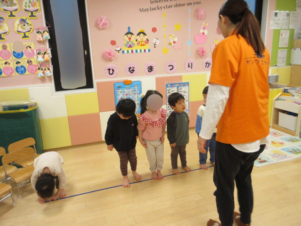 テープに立ち位置が書かれており、「ここ〜?」「ピシッとたつんだよ!」とお友だちと教え合いながら頑張っていますよ![]()