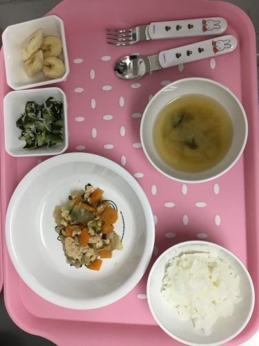 2018.04.18|給食ピックアップ 4月17日のお給食 お給食をまた毎日、載せていきたいと思います 今日のお給食は『鳥のすき煮』『酢の物』」『玉ねぎとわかめのみそ汁』『バナナ』 鶏肉をひき肉にしてもらい美味しくいただきました。 小規模保育園 サンライズキッズ名古屋港園 前へ 次へ