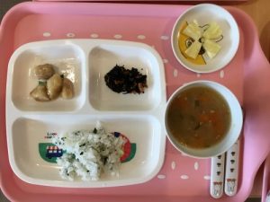 今日のお給食は「筑前煮」「白みそ汁」「ほうれん草の胡麻和え」「りんご」です 離乳食は「おかゆ」「人参...