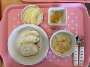 今日のお給食は「コーンクリームシチュー」「春雨あえ」「パン」「りんご」です 離乳食は「おかゆ」「ジャ...
