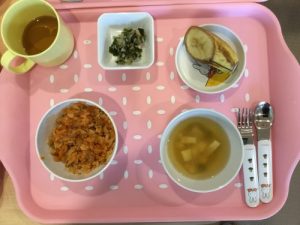 今日のお給食は「チキンピラフ」「豆腐と玉ねぎのみそ汁」「わかめの酢の物」「バナナ」です 離乳食は「お...