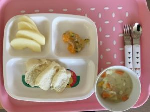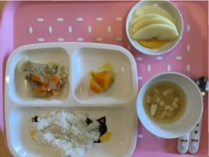 今日の給食は「コーンクリームシチュー」「パン」「春雨あえ」「リンゴ」です 離乳食は「おかゆ」と「人参...