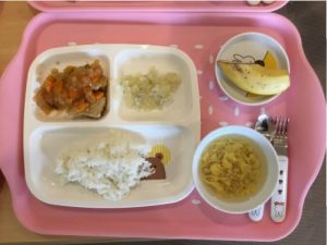 今日のお給食は「酢豚風そてー」「コンソメスープ」「キャベツの和え物」「バナナ」です 酢豚は子供たちが...