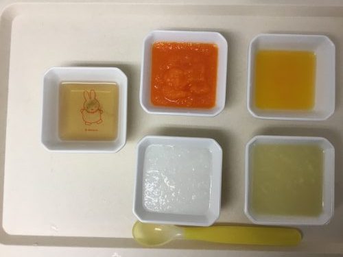 離乳食は「おかゆ」「にんじん」「じゃがいも」「オレンジの果汁」です