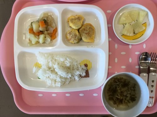 今日のお給食は「ささみのピカタ」「ツナとジャガイモ煮」「もずくスープ」「パイナップル」です