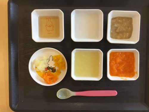 離乳食は「おかゆ」「にんじん」「ジャガイモ」「カボチャ、人参、ジャガイモのコロコロ煮」