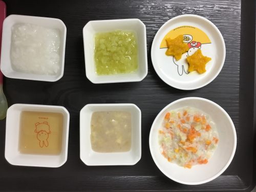 離乳食は「野菜のミルク煮」「キラキラかぼちゃ」「きゅうり」「バナナ」「おかゆ」です