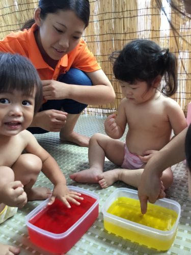 今週は寒天遊びをしました!ひんやりと冷たくて気持ちがいいので真夏の遊びにぴったりです。