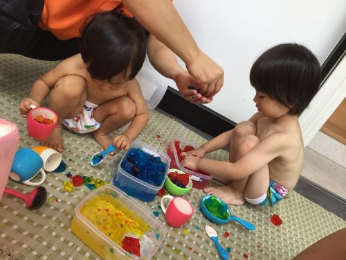 ぎゅっと手で握って潰してみたり、途中から、色と色が混ざり合い、色の変化をみて「ブラックー!」と驚いている子ども達。感触が苦手な子には少しつづ小さいかけらを渡してみたりして、少しづつ慣れていくようしました。ままごとのお皿にスプーンで寒天を入れて「どうぞ~」。ままごとが始まりました。混ぜ混ぜしたり「アーンパク」と食べるマネっこをしたりして楽しみました~!