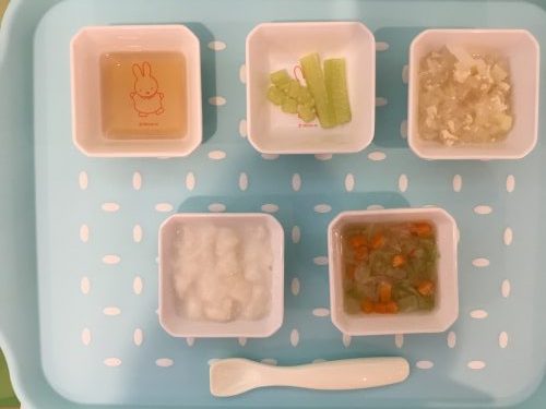 離乳食は「パンがゆ」「そぼろ煮」「スティックきゅうり」「野菜スープ」です