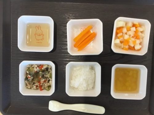 離乳食は「おかゆ」「みそ汁」「茄子とひき肉のみそ炒め」「ゆでやさい」「スティック人参」です