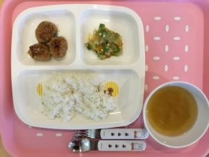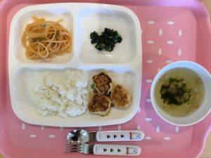 今日のお給食は「ごはん」「おすまし」「鶏のマーマレード焼」「スパゲッティー」「小松菜のおかか和え」で...