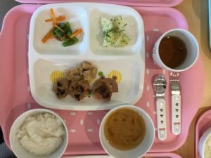 今日のお給食は「ごはん」「みそ汁」「白身のムニエル」「きゅうりとキャベツのおかか和え」「ひじきの炒り...