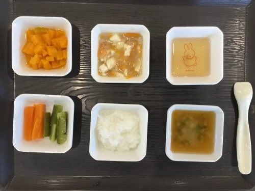 2018.09.13|給食ピックアップ 9月13日のお給食です 今日のお給食は「ご飯」「かぶのみそ汁」「麻婆豆腐」「梅和え」「かぼちゃの素揚げ」です 離乳食は「軟飯」「カブのみそ汁」「麻婆豆腐」「かぼちゃの素揚げ」「きゅうりと人参のスティック」です 前へ 次へ