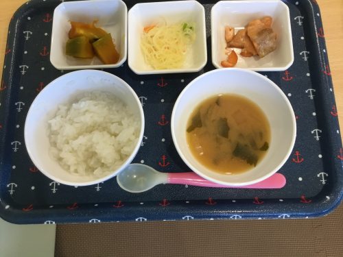 今日のお給食は「ご飯」「ワカメと玉ねぎのみそ汁」「鮭の照り焼き」「焼きビーフン」「カボチャ煮」です。