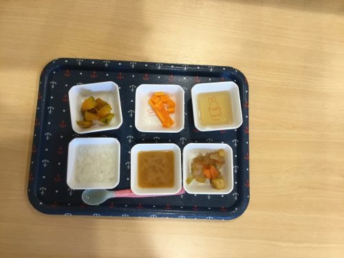 離乳食は「軟飯」「玉ねぎのみそ汁」「カボチャ煮」「人参スティック」「ジャガイモ煮」です(中期食)