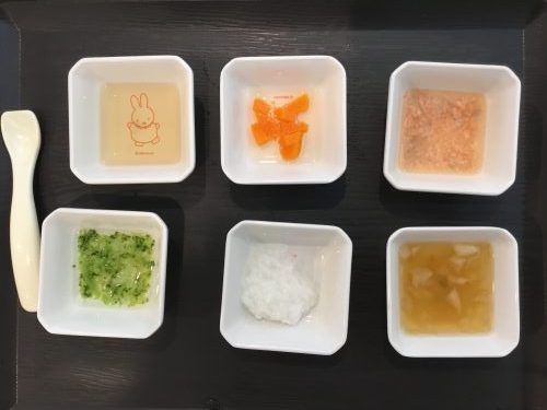 離乳食(後期・中期)は「軟飯」「わかめの味噌汁」「鮭塩焼き」「ひじきの炒め煮」「茹でブロッコリー」「人参スティック」です