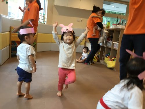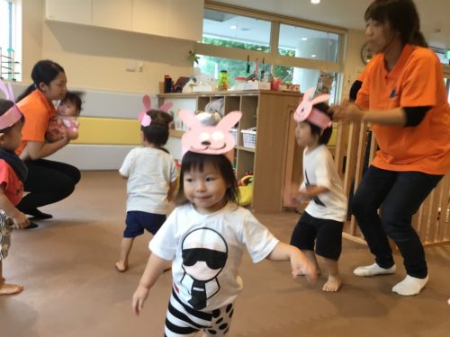 おやつの後は自分で作った「ウサギのお面」を被って、ウサギに」なりきに」って表現遊びをしました。