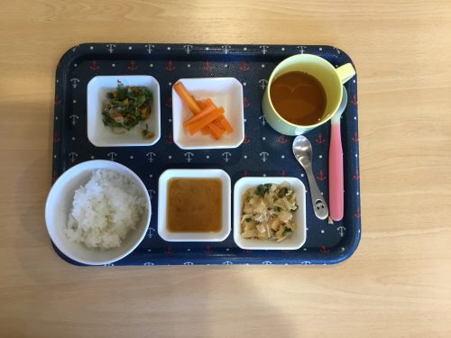 2018.09.28|給食ピックアップ 9月28日のお給食です 今日のお給食です 「ご飯」「玉ねぎのみそ汁」「鶏肉のすき焼き風」「おかか和え」「みかん」です 離乳食(後期食です)は「軟飯」「みそ汁」「すき焼き風そぼろ煮」「おかか和え」「人参スティック」です 前へ 次へ