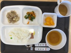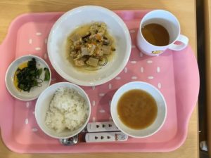 今日のお給食は「ご飯」「みそ汁」「高野豆腐の卵とじ」「小松菜のおかか和え」です 離乳食は「おかゆ」「...