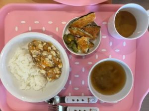 今日のお給食は「ご飯」「かぶのみそ汁」「麻婆豆腐」「梅和え」「かぼちゃの素揚げ」です 離乳食は「軟飯...