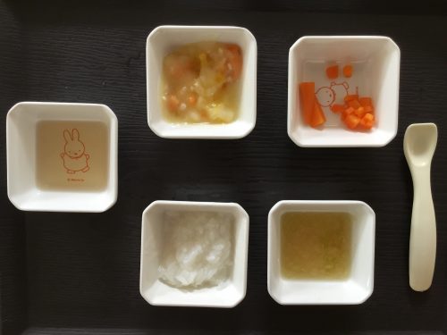 離乳食は「おかゆ」「シチュー」「おひたし」「人参スティック」です