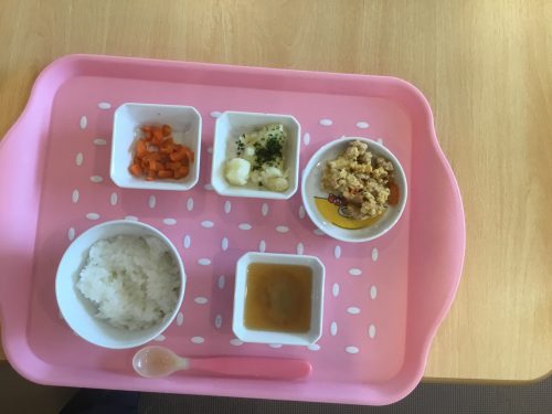 離乳食は「おかゆ」「みそ汁」「鶏肉の炒め煮」「ゆでじゃが芋」「人参スティック」です