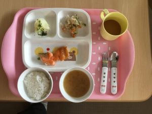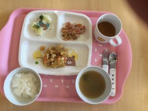 今日のお給食は「ご飯」「みそ汁」「照り焼きチキン」「スパゲッティーサラダ」です 離乳食は「おかゆ」「...