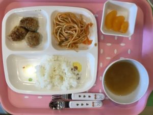 今日のお給食は「ご飯」「みそ汁」「しょうが焼き」「スパゲッティー野菜」「みかん」です 離乳食は「おか...