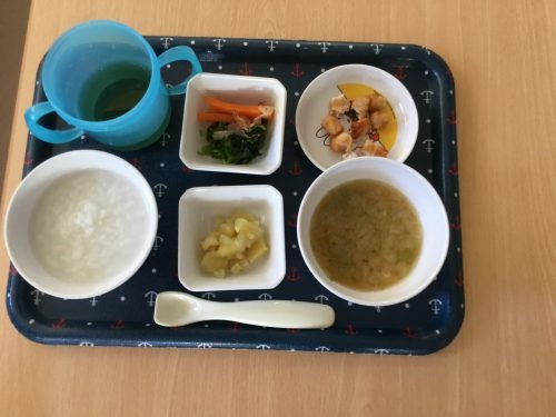 離乳食は「おかゆ」「みそ汁」「煮魚」「きざみおひたし」「ゆで人参」「ゆでさつまいも」です