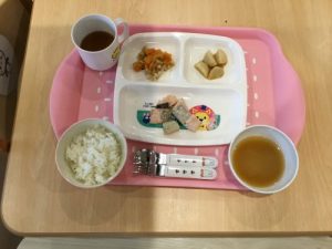 今日のお給食は「ご飯」「みそ汁」「鮭の塩焼き」「大根切り干煮」「里芋の甘味噌煮」です 離乳食は「おか...