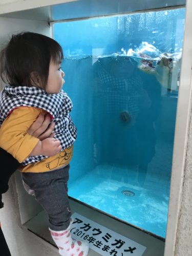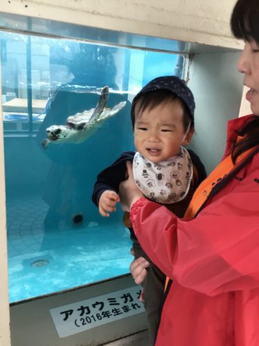 0歳児の子ども達は「いやだ~」と泣いている子もいましたが、数分で慣れて先生に体を支えてもらいじっと見ることが出来ました。