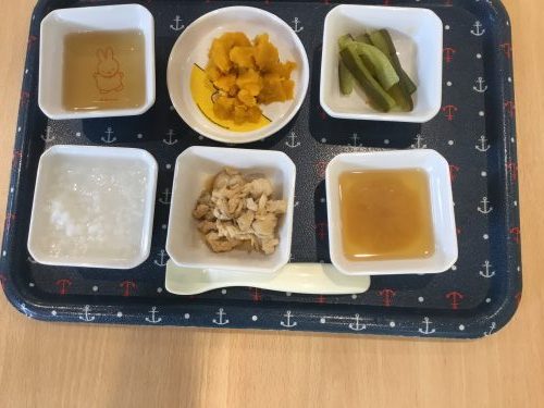 離乳食は「おかゆ」「みそ汁」「煮魚」「切り干し大根のナムル」「スティックきゅうり」「ゆでカボチャ」です