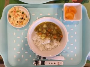 今日のお給食は「ご飯」「カレーシチュ」「マカロニサラダ」「みかん」です 離乳食は「おかゆ」「シチュー...