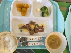 今日のお給食は「ご飯」「みそ汁」「鶏の照り焼き」「「スパゲッティ」「サツマイモ甘煮」です 離乳食は「...