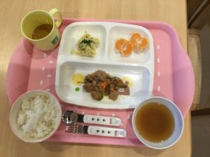 今日のお給食は「ご飯」「みそ汁」「ツナポテトサラダ」「豚肉のケチャップソースからめ」「みかん」です ...
