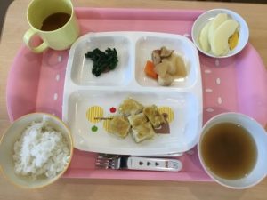 今日のお給食は「ご飯」「みそ汁」「カジキのカレームニエル」「おかか和え」「煮物」「リンゴ」です 離乳...