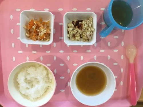 離乳食は「おかゆ」「みそ汁」「あんかけ豆腐ハンバーグ」「切り干し大根の煮物」です