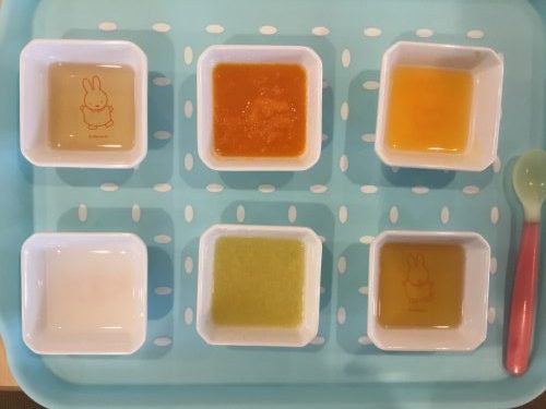 離乳食は「おかゆ」「みそ汁」「白菜煮」「にんじんペースト」「みかん果汁」です