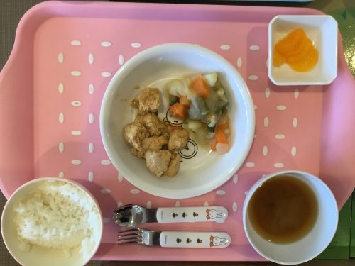 2019.03.01|給食ピックアップ 今日のお給食は「ご飯」「みそ汁」「チキンソテー」「含め煮」「みかん」です 離乳食は(初期)「おもゆ」「みそ汁上澄み」「にんじんペースト」「ジャガイモペースト」です 前へ 次へ