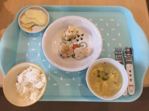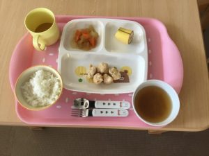 今日のお給食は「ご飯」「コーンスープ」「ローストチキン」「ポテトサラダ」「りんご」です 離乳食は(初...