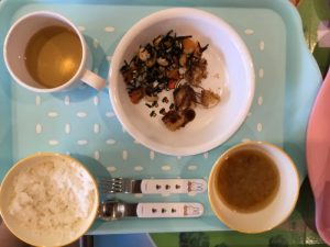 今日のお給食は、「ご飯」「味噌汁」「魚のフライ」「ひじきの炒り煮」です