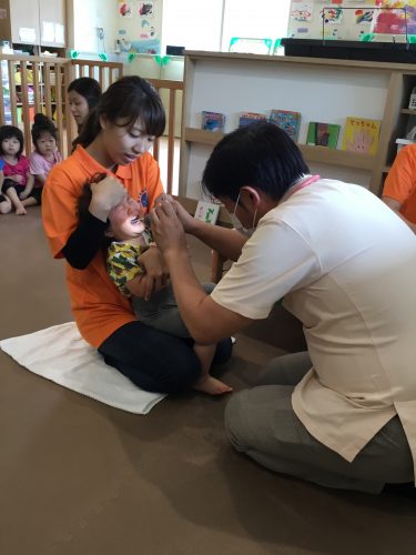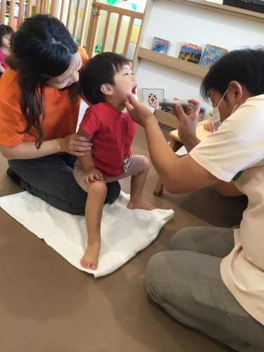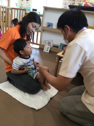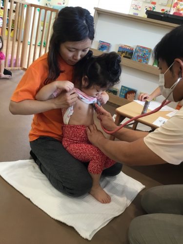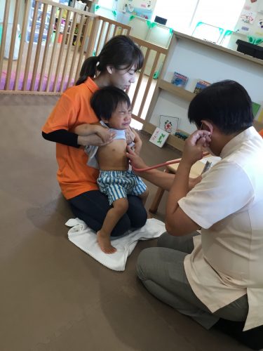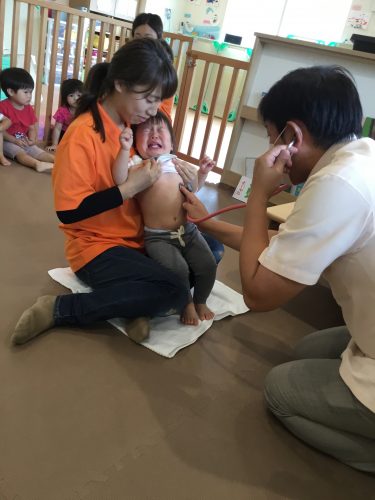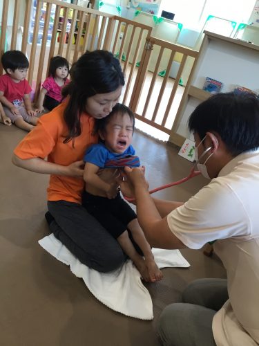子どもたちの健康な身体を見守るために来てくれた内科健診のお医者さん。いつもとちょっと違う雰囲気に泣いてしまう子もいましたが、みんな無事に終えることが出来ました!よく頑張ったね!