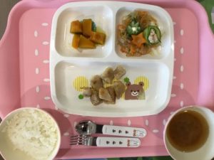今日のお給食は「ご飯」「「お味噌汁」「鶏肉のマーマレード焼」「七夕サラダ」「かぼちゃの甘辛煮」です ...