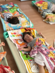 新入園児3人も他のお友だちと一緒に午睡の時間になると、コットン(ベット)に入って眠る姿が見られます。すっかり落ち着いた1歳児いちご組さん。