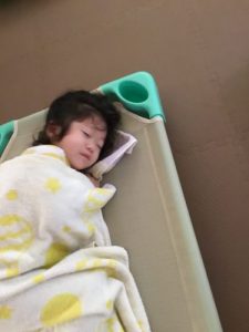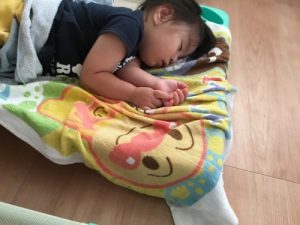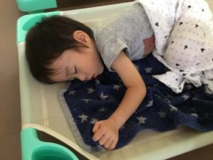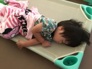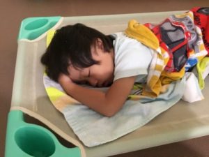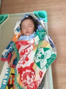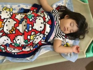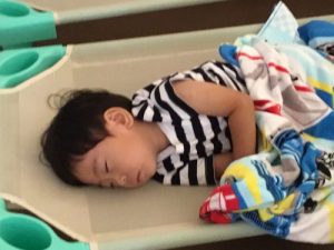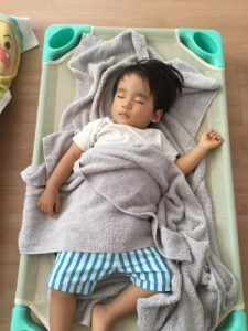 新入園児の男の子も入園当初は、泣いていることもあったけど、今では先生に見守られると安心して入眠。体力があって寝れない子もいるけれど、トントンされずに寝ていく姿はやっぱりサンライズキッズ保育園の2歳児りんご組お兄さん、お姉さんです。