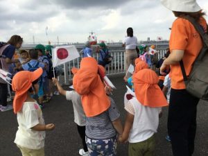 子どもたちも国旗を振って船の到着を待ちわびました。