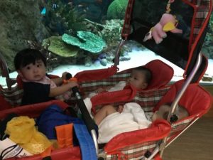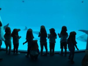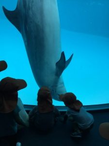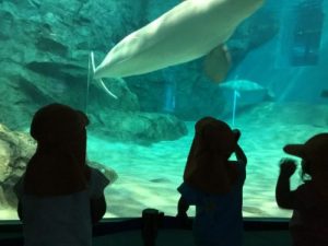 水族館の中に入ると大きな水槽の中でイルカやベルーガが心地良さそうに泳いでいました。その大きさに圧倒される様子もありましたが、すぐに慣れて水槽の前に並んで目をキラキラ輝かせて眺めていましたよ♪