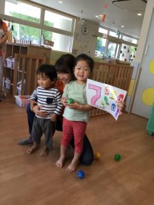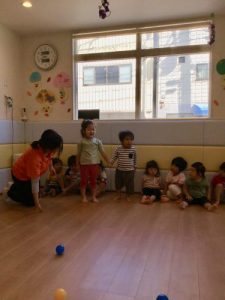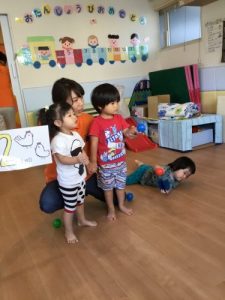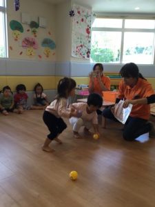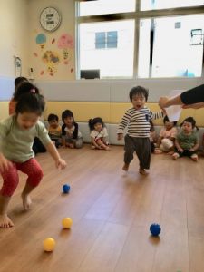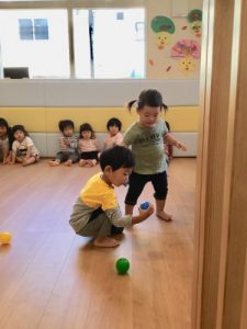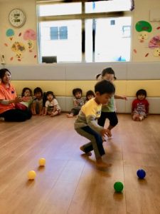 2歳児のお友だちがリードして探して…見つけたら保育士にボールを渡してその数字を発音します!