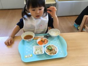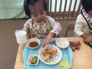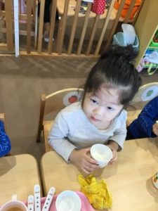 1歳児はと言うと、先生が「おてて洗う前に袖まくまくしようね〜」と伝えている最中です。まくるのが難しくて「デキナイー」と言っていましたが、最近では声をかけると、小さな手で袖をまくるのを頑張っていますよ!